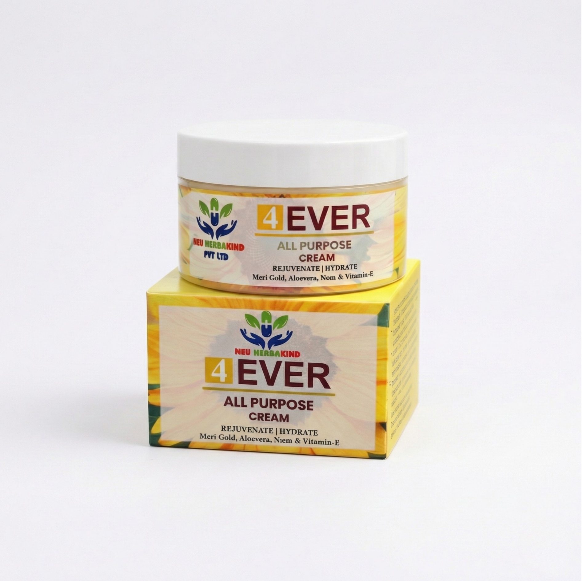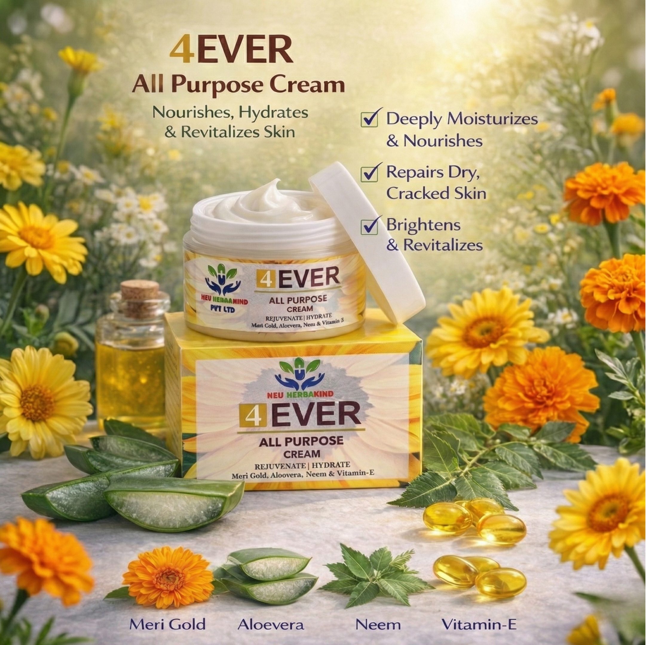 Neu Herbakind 4EVER All Purpose Cream is a nourishing skin care formula designed to hydrate, revitalize, and protect the skin. Enriched with natural ingredients such as Marigold, Aloe Vera, Neem, and Vitamin-E, this cream helps maintain soft, smooth, and healthy-looking skin.