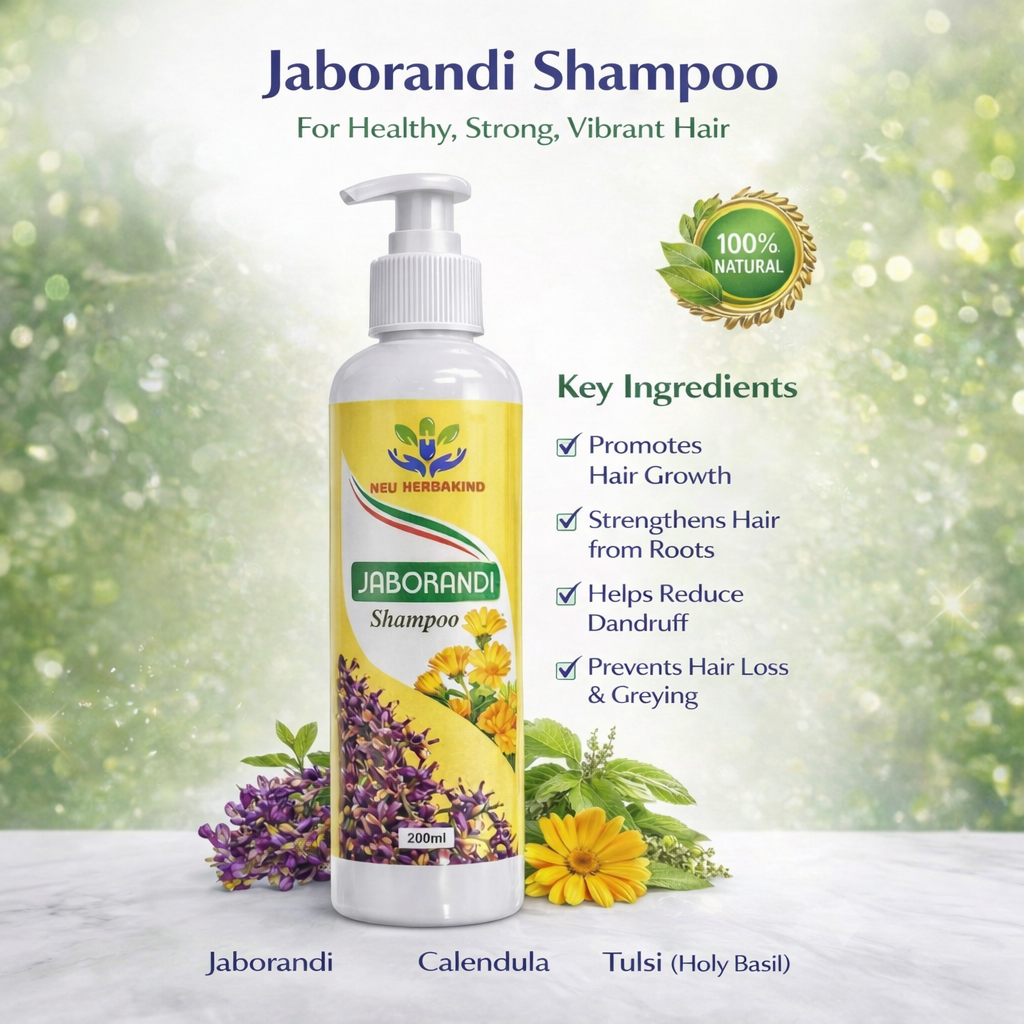 Neu Herbakind Jaborandi Shampoo is a herbal hair care formulation designed to support healthy, strong, and vibrant hair. Enriched with natural ingredients like Jaborandi, Calendula, and Tulsi (Holy Basil), this shampoo helps nourish the scalp, strengthen hair roots, and promote healthy hair growth.