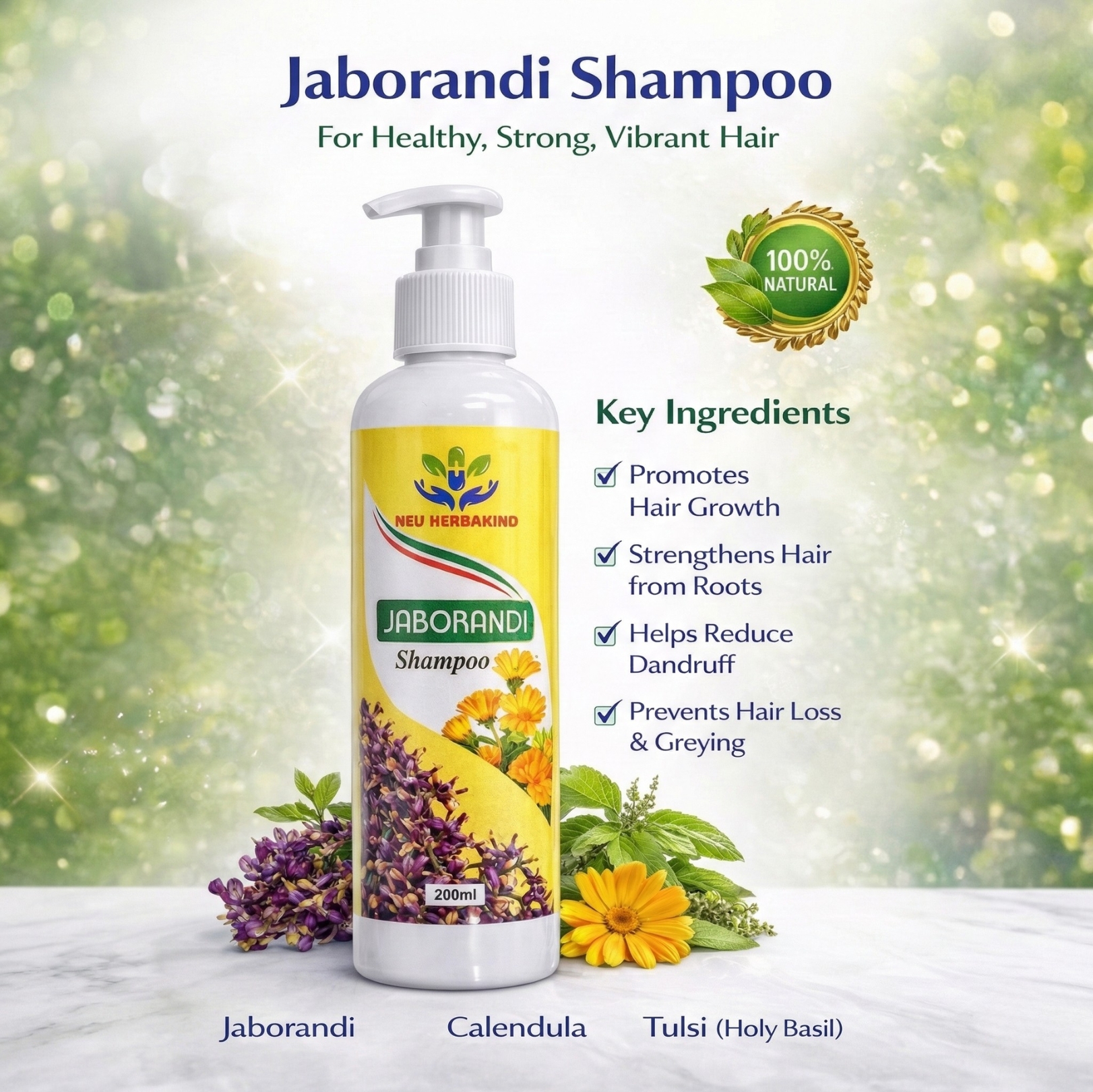 Neu Herbakind Jaborandi Shampoo is a herbal hair care formulation designed to support healthy, strong, and vibrant hair. Enriched with natural ingredients like Jaborandi, Calendula, and Tulsi (Holy Basil), this shampoo helps nourish the scalp, strengthen hair roots, and promote healthy hair growth.